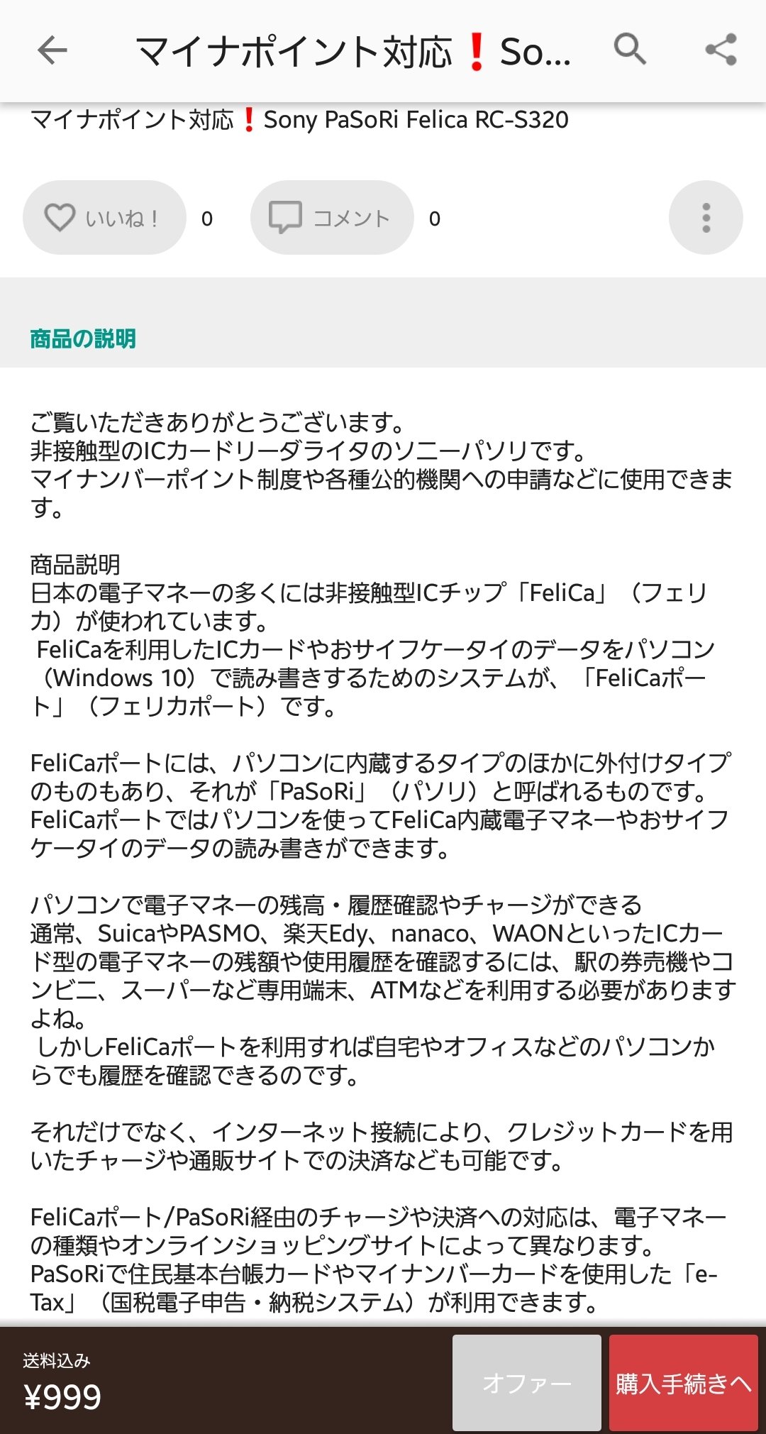 Paypayフリマ Sony 非接触icカードリーダー ライターpasori Rc S320